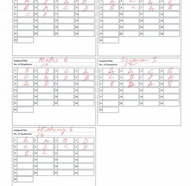 Each order includes five (5) worksheets, with answer boxes numbered 1 to 25. Please complete all five worksheets by entering the subject, number of questions, and the correct answers.